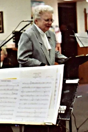 In 1985, Elaine Parker-Shaw became the conductor. Ms. Parker-Shaw earned a Bachelor of Music Degree from the University of Michigan. She was a band director at Harrison Park and Riverside junior high schools in the 1950s. The Symphonette continued the tradition of bringing music to people in retirement communities under her direction. It was during Ms. Parker-Shaw’s tenure that the orchestra first performed on Royce Stage at the St. Cecilia Music Society.
